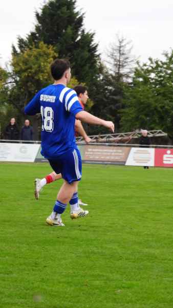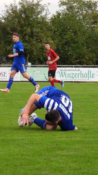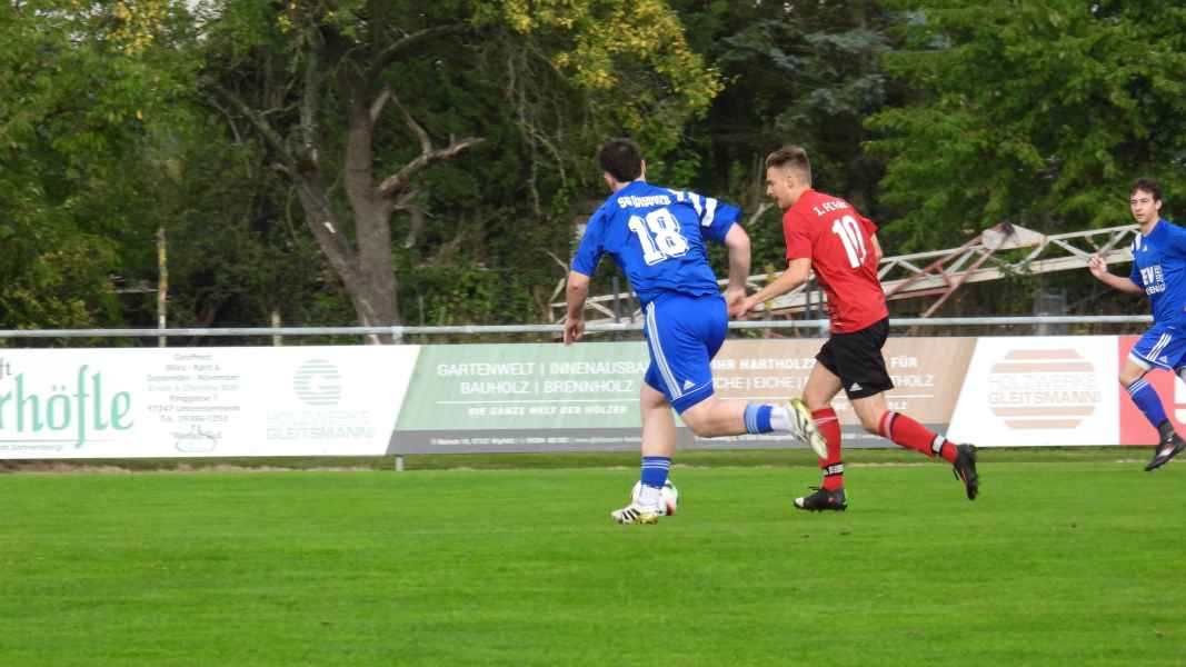 Kurz darauf geriet die SG durch ein unglückliches Eigentor in Rückstand: Nach einer Ecke rutschte Finn Hochrein der Ball über den Scheitel und landete im eigenen Netz. Danach entwickelte sich ein ausgeglichenes Spiel mit viel Kampf im Mittelfeld, ehe Fahr kurz vor der Pause erneut zuschlug: Nach einem vermeidbaren Eckball stand Spielertrainer Abendroth im Zentrum frei und köpfte zum 0:2 ein. Mit diesem Rückstand ging es in die Halbzeit.