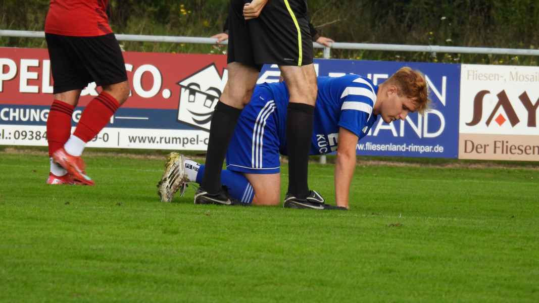 Kurz darauf geriet die SG durch ein unglückliches Eigentor in Rückstand: Nach einer Ecke rutschte Finn Hochrein der Ball über den Scheitel und landete im eigenen Netz. Danach entwickelte sich ein ausgeglichenes Spiel mit viel Kampf im Mittelfeld, ehe Fahr kurz vor der Pause erneut zuschlug: Nach einem vermeidbaren Eckball stand Spielertrainer Abendroth im Zentrum frei und köpfte zum 0:2 ein. Mit diesem Rückstand ging es in die Halbzeit.